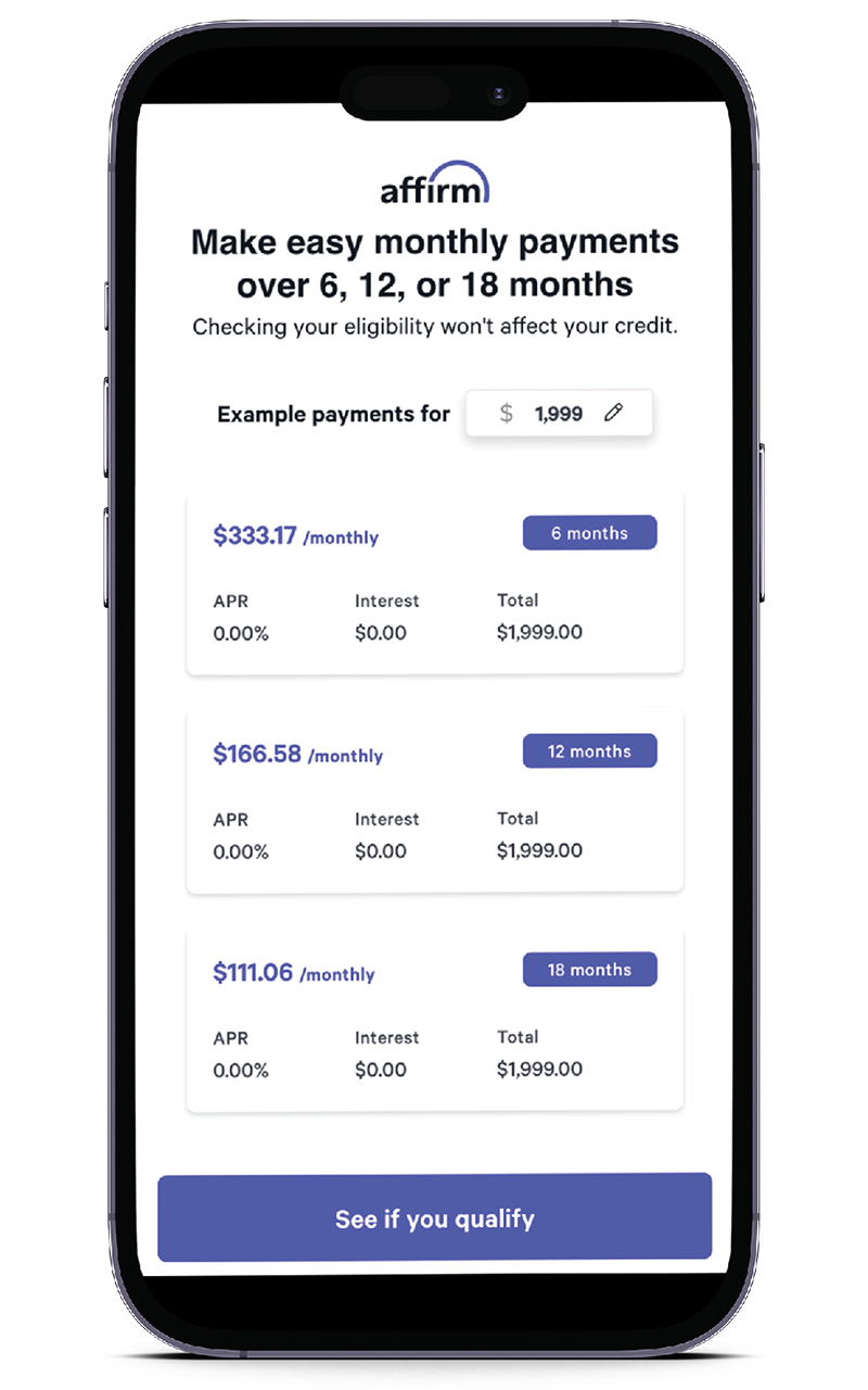 Your rate will be 0-36% APR based on credit, and is subject to an eligibility check. For example, a $700 purchase might cost $63.18/mo over 12 months at 15% APR. Payment options through Affirm are provided by these lending partners: affirm.com/lenders. Options depend on your purchase amount and a down payment may be required.
