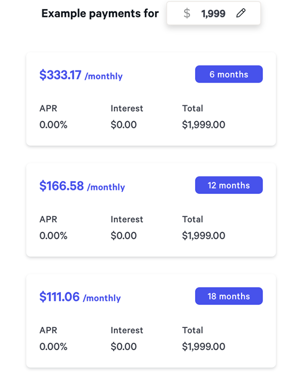 Affirm loans usually have 3-, 6- and 12-month terms. You can choose which option you prefer. There are also exceptions, however. For very large loans, you may have the option to extend up to 36 months. For very small loans, you may only have the options of 1-3 months and no longer. You are always given options up front when you make your purchase, with fully transparent interest costs.